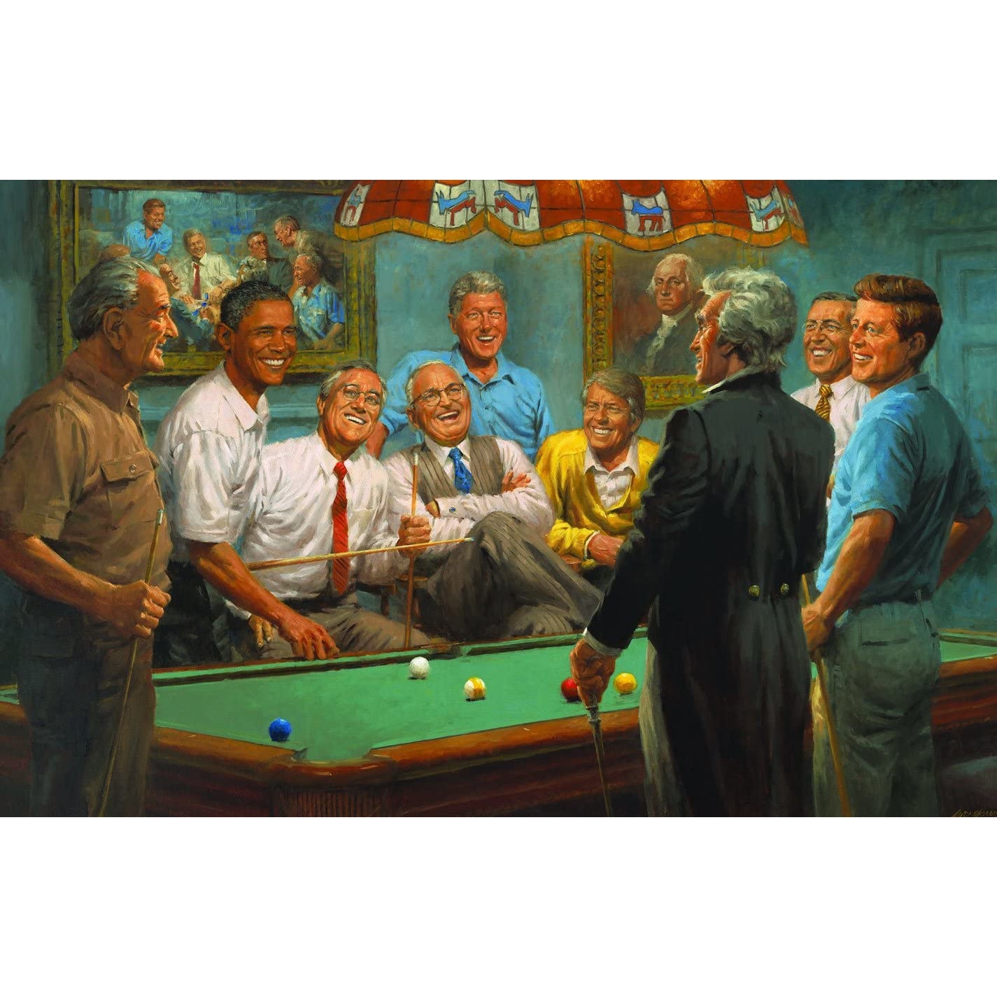 Barack Obama, Bill Clinton, Thomas Jefferson, JFK and other democratic presidents gather around a game of pool in this 1000-piece fantasy jigsaw puzzle by SunsOut. Finished puzzle 19"x30". Artist: Andy Thomas