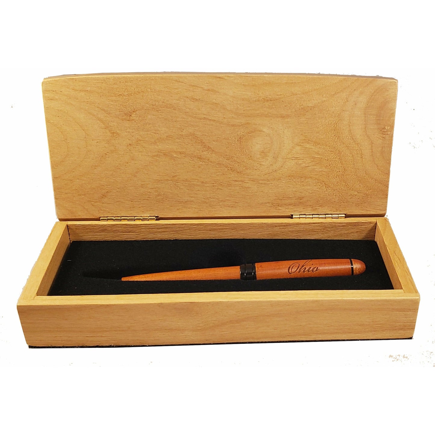 Script Ohio engraved into the top of the pen box with a velvet lined inside cradles cherry wood pen a Script Ohio engraved on the pen.